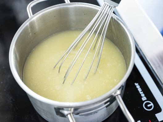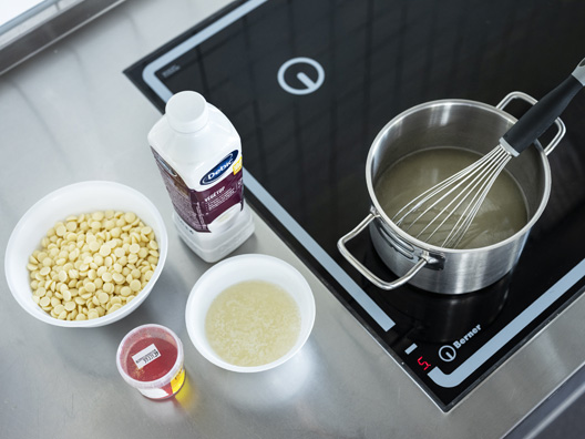 Kook de suiker, glucosestroop en het water. Laat de gelatine wellen (tip: verhouding gelatine 1 op 5 water).