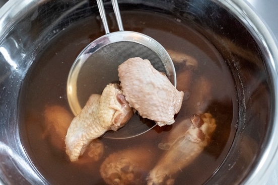 Verwarm het water en los de suiker en het zout op in het water. Voeg de theeblaadjes 5 minuten toe aan het hete water. Gooi de theeblaadjes weg en koel de pekel terug in de koeling. Pekel de kip 6 tot 12 uur in de pekel.