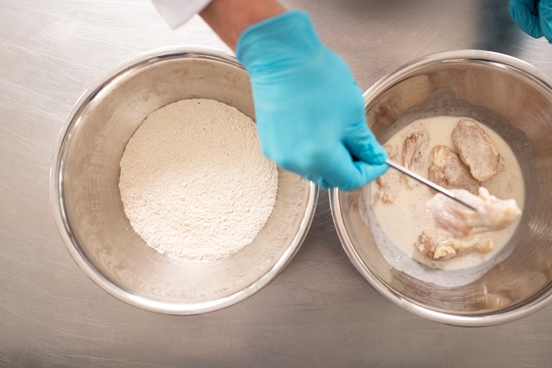 Meng bloem, zetmeel en kikkererwtenmeel en kruiden. Dompel de kip dubbel in de bloem. Laat 15 minuten rusten of bewaar een nacht in de koelkast. Je ziet dat het paneermeel aan de kip blijft plakken en het vocht heeft opgenomen.