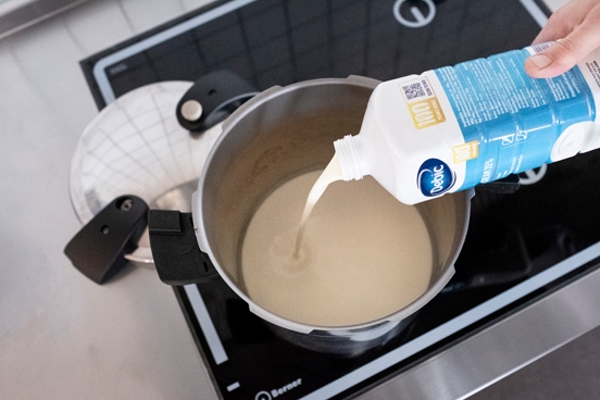 Schenk de ongezoete slagroom in de snelkookpan. Maximaal 1 liter in een 5 liter hogedrukpan. Voeg theelepel aan baking soda toe. Roer goed door zodat het oplost, dit is belangrijk zodat het niet aan de bodem van de pan blijft zitten en de kans op aanbranden geeft. Breng de room langzaam aan de kook.