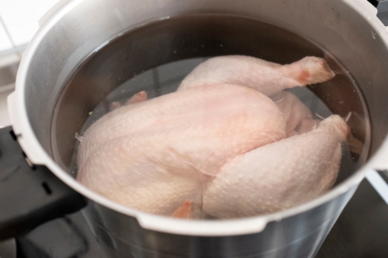 Spoel de soepkip met koud water schoon en breng aan de kook in koud water. Laat 5 minuten koken en spoel daarna koud. Zodat alle gestolde eiwitten eraf zijn.
