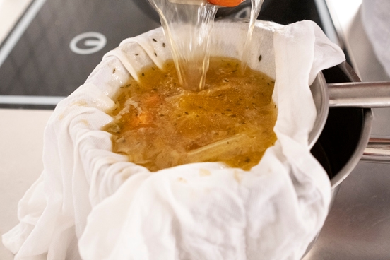 Passeer de bouillon door een passeerdoek en verwerk verder.