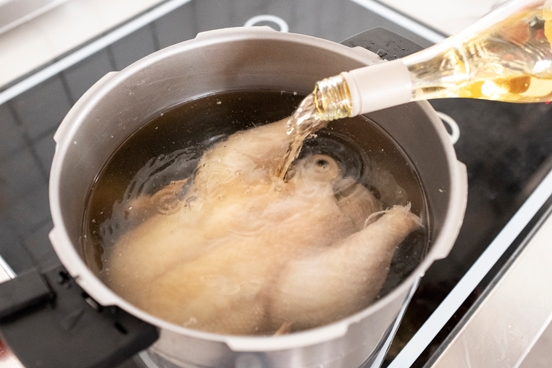 Zet de soepkip opnieuw op met koud water en witte wijn.