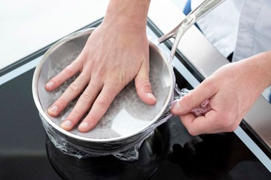 Zet het vuur uit, leg plastic folie over de warme pan en duw die naar beneden