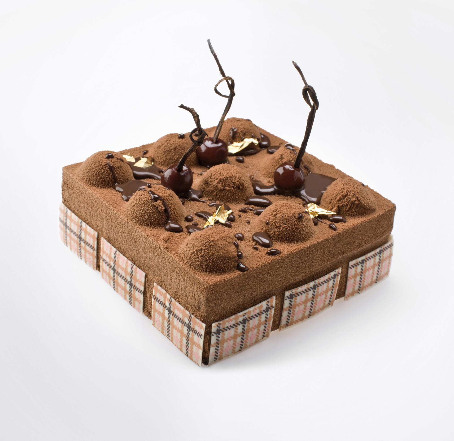 na czekoladowym biszkopcie z czekoladowym kremem i wiśniowym ganache
