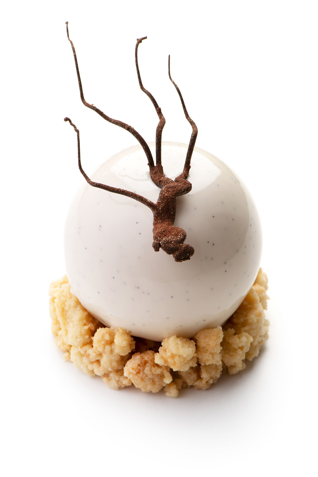 Kule z musu cynamonowego i jabłek pokryć glazurą waniliową i ułożyć na krążkach z kruszonki cynamonowej.