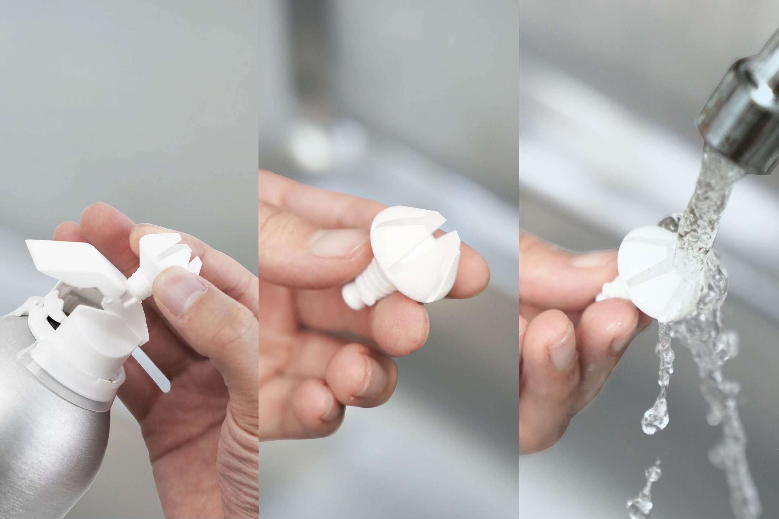 2. ล้างหัวบีบด้วยน้ำสะอาด ซึ่งถ้าหากใช้น้ำอุ่นจะช่วยขจัดคราบไขมัน และล้างออกได้ง่ายมากยิ่งขึ้น