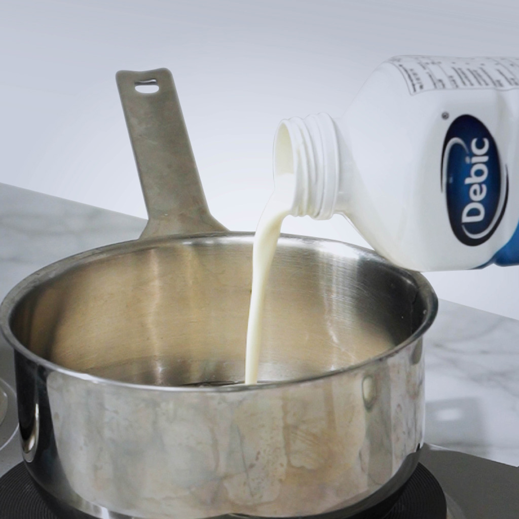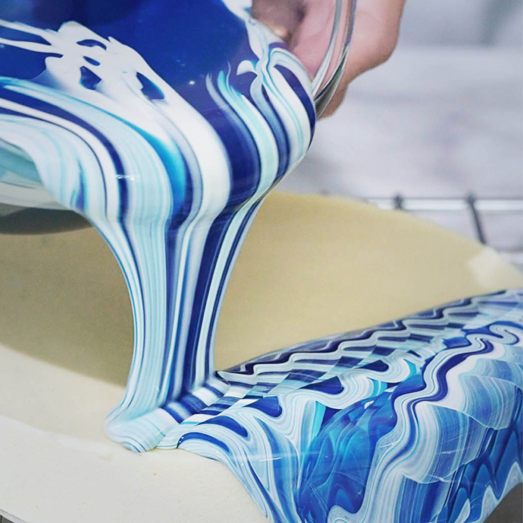ค่อย ๆ เทลงบนหน้า Mousse Cake ที่เย็นจัด เพื่อให้น้ำตาลจับกับตัวเค้กได้ดี และไม่ละลาย รังสรรค์ลวดลายผสานกับเทคนิคเฉพาะตัวทางศิลปะ โดยเทจากด้านซ้ายไปขวา กลับไป – มา จนทั่วหน้าเค้กทั้งก้อน