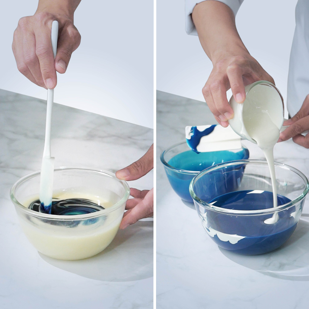 เทสีผสมอาหารจากธรรมชาติให้ได้โทนสี และจำนวนสีที่ต้องการ โดยเทสีน้ำเงินสลับขาว พร้อมทั้งออกแบบลวดลาย